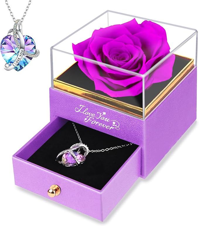 I bought this as an anniversary gift and it was a total hit. The purple rose looks stunning in the clear display box, and the necklace sparkles beautifully in person. The little drawer makes it feel extra special—like a real keepsake box. Everything arrived well packed and looked exactly like the photos.