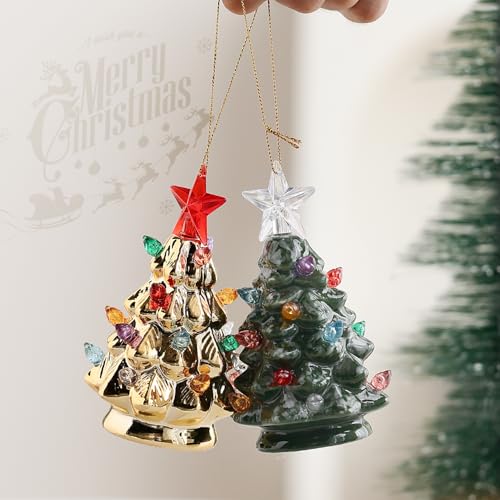 - CHRISTMAS ORNAMENT: These beautiful ceramic ornaments are an ideal addition to your tree and is sure to become a cherished heirloom for seasons to come. Light up ceramic tree measures 4.5" and includes a golden hanger.