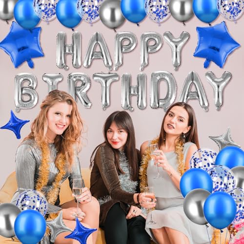 Blue Happy Birthday Balloons Decorations Royal Blue Silver Birthday Balloons Letters Banner 6 Pcs Star Balloons Blue Artif...