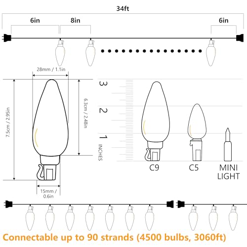 Features: Brizled 33ft 50 LED Faceted Red & Warm White C9 Christmas Lights, End-to-End Connectable (Up to 90 Sets 4500 lights) of Brizled 50 LED C9 Light Sets), UL Certified, Green Wire Unique red & warm white C9 string lights, emitting a red and warm glowing, are not only fit to create a vivid and festive feel for your Christmas, ideas for decorating and illuminating inside the party or outdoor roofs to create a romantic ambiance but also would create a welcome and joyful atmosphere for spring festival and the winter season. Can be widely applied to decorate roofs, pathways, trees, windows, gardens, fences, doors, wreaths, patios, pergolas, bushes, hedges, fences, pillars etc. Built-in rectifier, more stable, flicker-free Ultra-low power consumption Cool to the touch when lit Connect end to end up to 90 sets (4500 lights) of Brizled LED 50 C9 light sets Up to 25,000-hour bulb life Durable and break-resistant Specification: Lighted length: 33ft Total length: 33.5ft Bulb spacing: 6in Light Color: Red & Warm White Wire Color: Green Wire Light Display: Steady On Replaceable fuse plug Extra fuse included Plug Type: Fused/Stackable, End-to-End Connectable Electrical rating: 120V, 60Hz, 0.08A, 2.4 Watts Usage: Indoor / Outdoor Actual Power: - 2.4 Watts / Strand - 216 Watts End-to-end Maximum - 90 Strands connected Package Included: 1 x 50LED C9 Red and Soft White C9 String Lights 1 x Fuse 1 x User Manual
