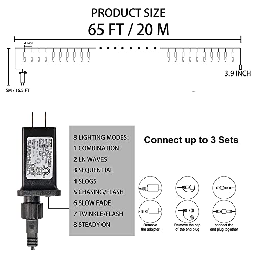 - 8 Lighting Modes: Christmas 200 LED mini string lights with 8 light modes: combination, in waves, sequential, slogs, chasing/flash, slow fade, twinkle/flash, by pressing the button on the transformer to choose the modes you like.