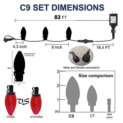 - Light Specifications: With 100 LED C9 string lights, each Christmas string lights is 82.5 ft long in total, wire with LED bulbs is 66 ft, lead wire without lights is 16.4 ft, spacing between per LED bulb is 8 inch. 29V low voltage, keep at a low temperature state after lighting up for hours, ensure the safety.The LED Light Holder design is protected by U.S. Patent No. D914271.Our store is duly authorized to offer this product by the patent owner.