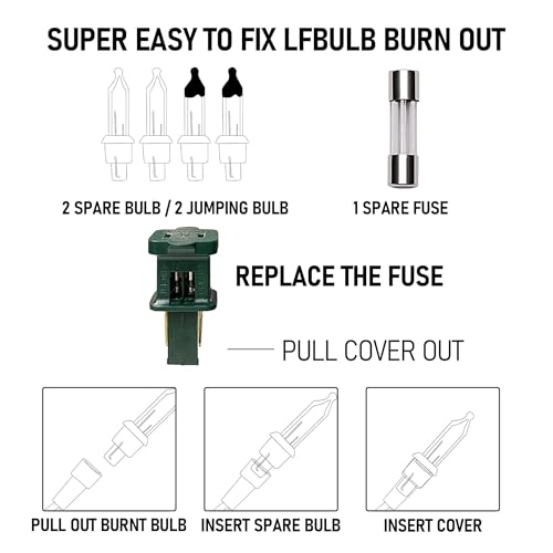 - Lights Size: The Christmas mini string lights includes 100 count incandescent light bulbs, the total length is 20 ft, the length of string light is 18.5 ft, lead wire is 1.5 ft, spacing between each light is 2.25 inches. The string light built-in 3A fuse and it is 120V high voltage with UL Certificated for safety, ensure the safety of you and your family. Package Includes: 1 x 20 ft light string, 1 x spare fuse, 2 x replacement incandescent bulbs, 2 x flasher bulbs.