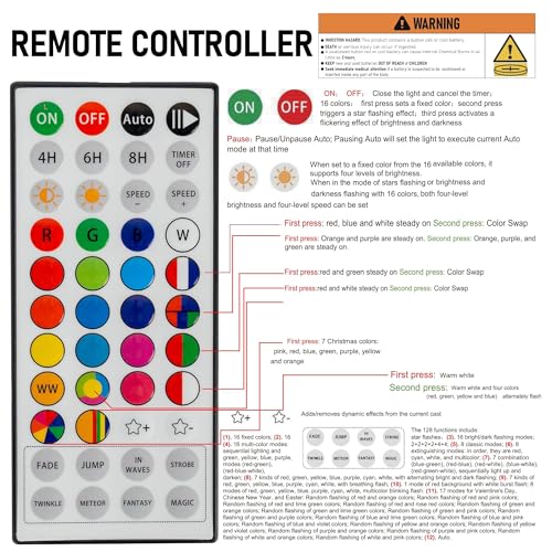 - Dual Control Modes: 1. When using the Bluetooth app, you can enjoy features like group control, DIY customization, scene settings, music synchronization, microphone mode, timers, display collections, and looping playback. 2. With the 44-Key remote, you can easily adjust brightness, speed, set timers, and switch lighting modes effortlessly. Multiple Christmas light strings can be added to the same group for integrated control; however, the strings light cannot be connected end to end.