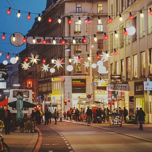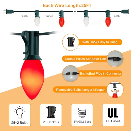- End to End Connectable: Total length 25 feet vintage Christmas lights with 25 hanging socket, 6 inch lead with male plug, 12 inch spacing between bulbs, 6 inch tail with female connector, outdoor Christmas hanging string lights can connect up to 28 same string light. Tips: If one bulb goes out will not affect other bulbs, a built in spare fuse in its male plug for easy replacement