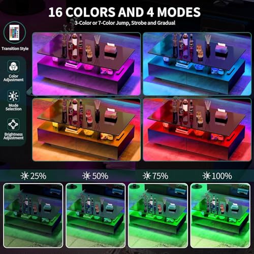 - Set the Mood with LED Lights: You can easily switch between 16 stunning colors and 4 dynamic modes with the remote, creating the ideal vibe for any occasion. Whether you're winding down or hosting, this coffee table with storage adapts to your mood