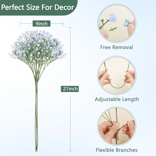- Durable & Adjustable: The branches and 21 inch long stems of babys breath artificial flowers bulk for decoration are made of durable plastic-wrapped wire, which is flexible and easy to shape, very sturdy and durable. You can adjust the shape of the branches, bend the stems or cut them shorter to fill a vase or create stunning centerpieces.