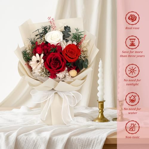 - Can Last for 3-5 Years: Our preserved roses bouquet are uniquely processed and have a long flowering period, while fresh flowers will wither within a few days. Our forever rose bouquet can be used for 3-5 years.Not only is it an artistic ornament that elevates the style of your home, but it is also a perfect gift that carries your heartfelt sentiments. Forever flowers bouquet can not only decorate your dining table, bedside table, and study room for a long time, adding romance and tranquility to your life, but also, presented in an exquisite gift box, can directly serve as a decent, unique, and meaningful gift, conveying your cherishment and love for her
