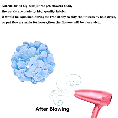 Color: Light Blue 34 PCS Artificial Silk Hydrangea Heads Size:Hydrangea Heads diameter:7 inch/18 cm;stem length:10 inch/26 cm. Material:silk fabrics+ plastic; Packing: 34 pcs hydrangea flower heads.and with Stems Customer Need Knows: How to use flower stems? Use the thick end of the flower stem to accompany the hole in the flower head.(Not the narrow end) How to care of flowers? The flower will be squashed during transportation. Try to blow the flower with a hair dryer, or let it stand for several hours, and adjust the flower branch by hand, so that the flower will be more vivid.. What made of? Made of silk cloth,plastic stem with wire.The stem of artificial flowers can be adjusted its length according to requirements: Bent and pruned for shorter;