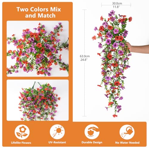 - Free Maintenance: No need for watering or sunlight – these artificial hanging flowers stay fresh and vibrant year-round. With the UV resistance and colorfastness, the fake outdoor flowers remains sturdy and vibrant in any weather condition. Enjoy their beauty without maintenance and the hassle of watering
