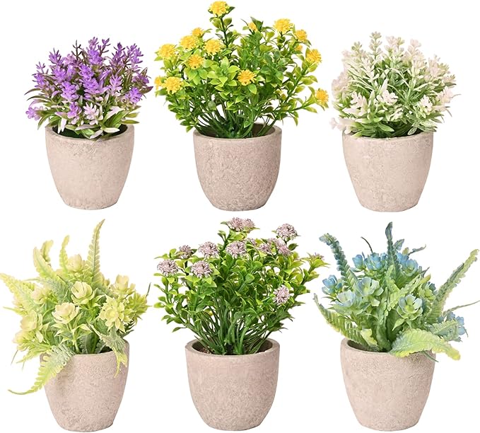 Specification Very durable and environmental Pot Dimension: approx. 2.2”(W)x2.2”(D)x2.1”(H) Total height: 4.1~4.9inches(Dimension parameters may have 1-2cm difference due to manual measurement. Material: Plastic, comes with a farmhouse slurry pot. Application: Indoor/ Outdoor use. Artificial Potted Flowers for Home Decor 6 pcs potted fake flowers Feature The wide selection of materials, unique shapes, Can be widely used in many places. No need for water and soil, nutrients, easy to maintain, not affected by natural climate. Evergreen in all seasons. The flowers are realistic, perfect for wedding decoration, table arrangement, or elegant home decoration. Home and Office Decoration The realistic greenery looks very lifelike and lovely. Its small size allows you to put it anywhere like office, home, kitchen, balcony, desk, bookshelf, and window ledge. Lifelike Flower The adorable artificial potted plants are full and bushy. It’s a perfect finishing touch to your home and office decoration, beautifully adding the right amount of color to your living space.