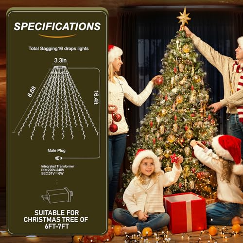 - 🎄 【Nice Design and Easy Installation】 🌟The Christmas decorative lights have 16 light strings, each 6.6 feet (2 meters) long, equipped with 25 LEDs, for a total of 400 LEDs. There is an installation ring at the top of the Christmas light, simply fix the ring on the top of the Christmas tree and let the 16 string lights hang down from the tree to complete the installation. The 16.4-foot (5-meter) power cord allows you to easily connect the tree light anywhere. Let the lights illuminate the entire room and enjoy the wonderful fairy tale light show!