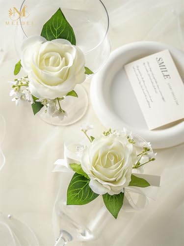 Meldel Ivory White Rose Wrist Corsage and Boutonniere Set for Wedding, Set of 2, Perfect for Vintage Wedding Accessories Anniversary, Dinner Party Prom Homecoming Decoration Product Description: Product Name:Ivory White Wrist Corsage and Boutonniere Set(2pcs) Package Includes:1pc wrist corsage with pearls wristband for bride bridesmaids, mother, grandmother and 1pc boutonniere for groom best man guests. 2pcs per set, great value. Size: Boutonniere is about 3.94in/12cm high, wrist corsage about 3.94in/9cm, wide. And the rose diameter is about 2.36inch. Material:Handcrafted with life-like silk roses, real touch leaves greenery, match withe babysbreath, wrist corsage has a elastic pearls bracelet, fits most of wrist sizes, It is more beautiful and comfortable to wear. Occasions: Perfect for various themed wedding decor such as rustic, boho, French, country, as well as anniversaries, ceremonies, festivals, prom, parties, snapshots, dance and as photography props decor flowers. Advantage: 1. High quality artificial flowers looks as real and beautiful as real flowers, and doesn’t look cheap at all and it likes eternal love, will never wither. Ideal real flower substitute. 2. All of the boutonnieres and wrist corsages are ready to use when you get them, It doesn't take time to do any assembly, saving you a lot of time and money for your wedding. 3. The beautiful and exquisite boutonniere makes you the center of attention at the wedding. A romantic Wrist corsage makes your wedding more beautiful and unforgettable. Excellent service: We insist on providing customers with higher quality products and services. If you have any question about your flower, please do not hesitate to contact us. Flowers may deform slightly during transportation, but you can easily adjust them to recover their beautiful shape by blow it through the low-heat steam of the ironing machine or hairdrier.