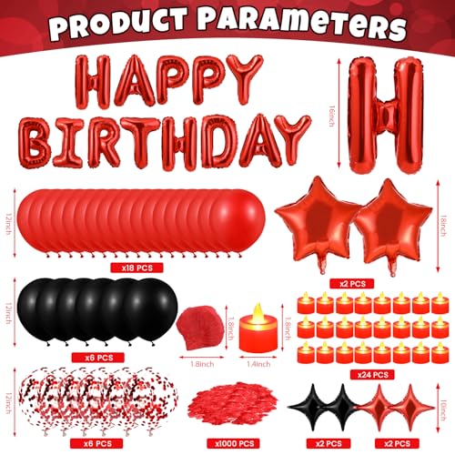 - Value Package: Our red birthday party decorations include 1 x 16" red happy birthday balloon letters, 2 x 18" red star balloons, 2 x 10" black star balloons, 2 x 10" red star balloons, 18 x 12" latex balloons Red, 6 x 12" latex balloons black, 6 x 12" latex confetti balloons, 1000 red artificial rose petals, 24 red flameless LED candles, 1 red balloon ribbon, 1 plastic straw