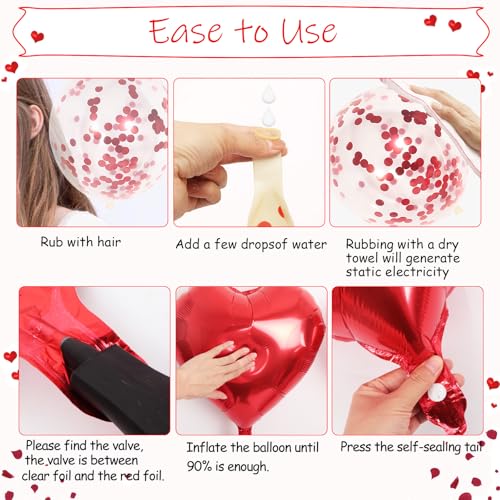 - Red Heart Balloons Set: Package include 12pcs 18inch red heart foil balloons, 6pcs 12inch heart latex balloons, 6pcs 12inch red latex balloons, 6pcs 12inch confetti balloons, 50pcs red heart hannging streamer decorations, 1pcs little tassel, 1pc straw, 1pcs ribbon.