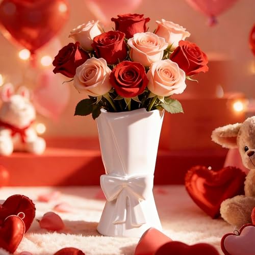 Relexome Fully Glazed White Ceramic Bow Vase 9.64 in Unique Cute Modern Decorative Bouquet Flower Vases for Home Living Ro...