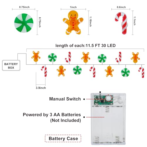 - 【Perfect Addition to Christmas】Designed with Gingerbread Man, Candy Cane and Candy LED lights, this 10 FT 30 LED christmas string light looks both cute and festive. Make your home and party more attractive and festive with these creative christmas lights battery operated