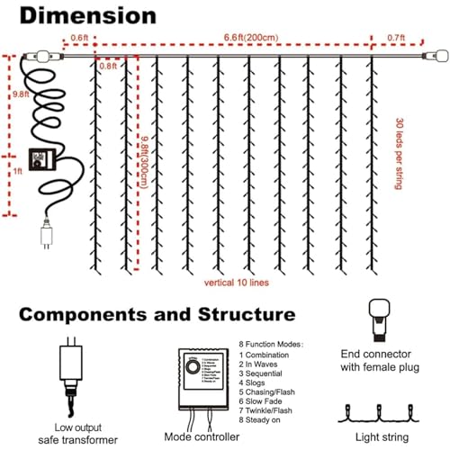 | Included Components | 300 LED curtain lights, 9.8ft power cord, mode controller with a remote control |