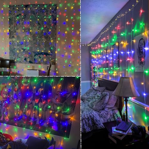 - Christmas Curtain Lights: Decorate with our 300 LED Christmas Multicolor curtain string lights with transparent wire, creates a warm festive atmosphere, surely lights up your room and house. A warm welcome sign at night to make your home a wonderful sight for your neighbors! US standard outlet, voltage 110V. Adapter to the first LED light: 9.8ft. Light size: 6.6 x 9.8ft