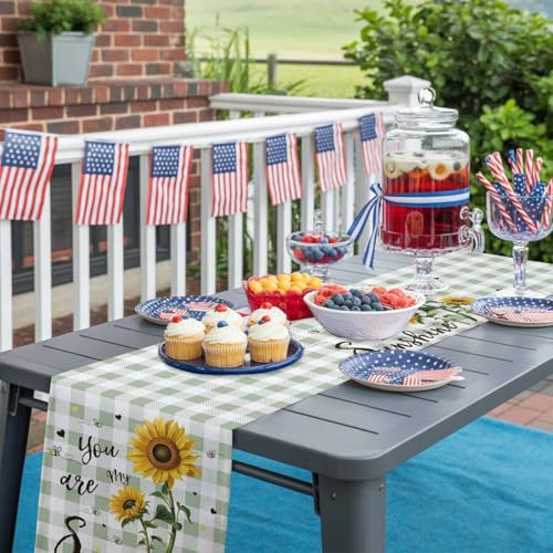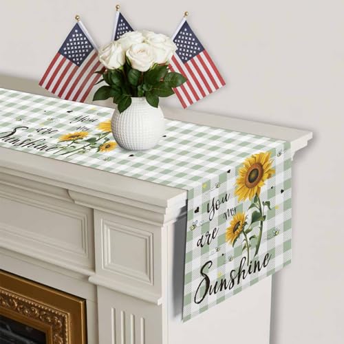 You are My Sunshine Table Runner 90 Inches Long, Vintage Yellow Sunflower Floral Bees Sage Green Plaid Table Runners Washa...