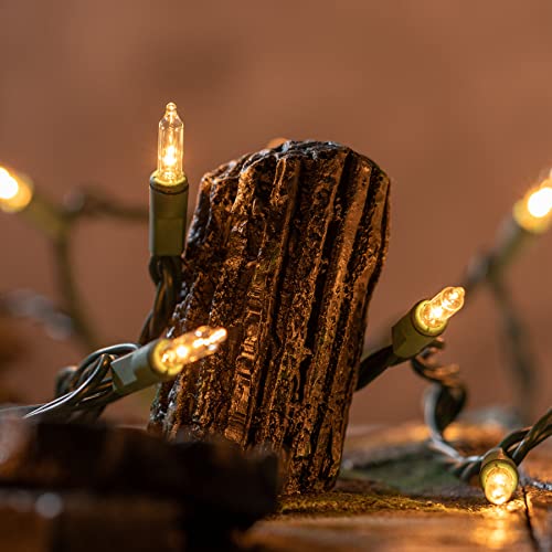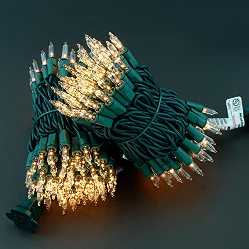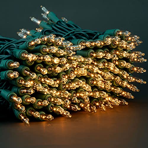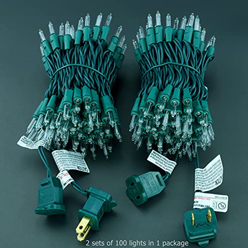 200 Clear Christmas Lights with Green Wire, Pack of 2 Strands of 21 ft 100 Count UL Certified Incandescent Mini String Light (Clear - Green Wire) ♥ SPECIFICATIONS Light Color: Clear (About 2700k, similar to warm white) Light Display: Steady Bulb Type: Incandescent Bulb Shape: Classic Bulb Material: Glass Removable Bulbs: Yes Average Hours: 3,000 Voltage: 120 V Wire Color: Green Wire Gauge: 22 AGW Male Plug: Fused/Stackable Female Plug: End-to-end Rating: UL Certified Grade: Premium Fire Resistance Rating: Class A 105℃ Ingress Protection Rating: IP44 Usage: Indoor / Outdoor Warranty: 3000 Hours Dimensions: - Total Length: 21 ft x 2 - Lead: 4 in - Spacing: 2.5 in - Tail: 4 in Power: - 40.8 Watts / Strand - 216 Watts End-to-end Maximum - 5 Strands Maximum Connection ♥ WHAT'S IN THE BOX: 2 x 100 Clear Incandescent String Lights 4 x Replacement Bulbs 2 x Replacement Fuses 1 x User Manual ♥ Warm Tips. 1. Two strands of 100 lights in one package. 2. Based on the working principle, incandescent bulbs warm up under operation. 3. The glass shell of the bulb can be broken. 4. Male and female plugs must not be wet or immersed in water. 5. End-to-end connections with more than 5 strands running simultaneously, or input voltage above 120 volts will blow the fuse. 6. Fuse is located in male plug and 2 replacement fuses included in each strand. 7. Additional fuses may be purchased locally at auto parts and hardware stores.